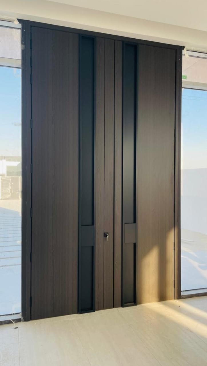 Porta com estrutura interna 100% em alumínio e revestida com chapa de ACM kynar 4 mm. Acompanha batente e vistas feito sob medida.