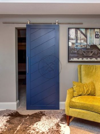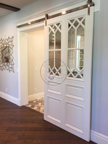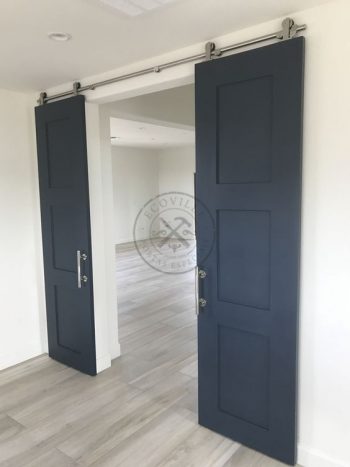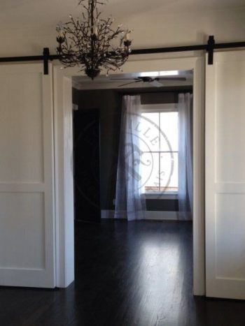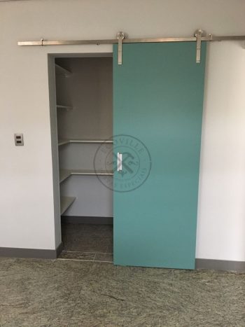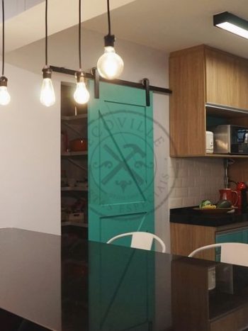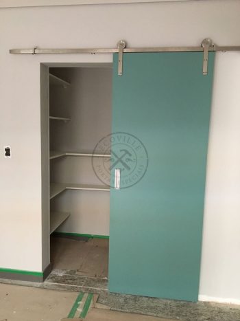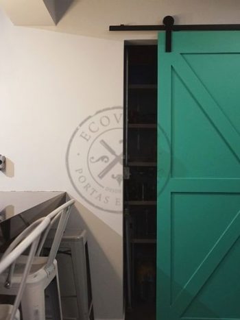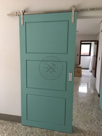 Porta com sistema de correr aparente de madeira maciça com pintura laca acetinado