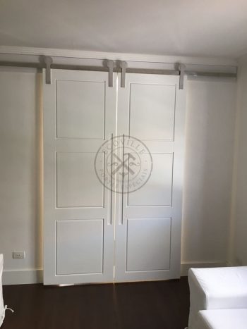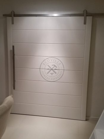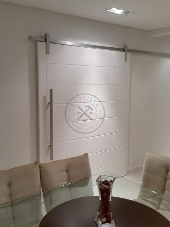 Porta com sistema de correr aparente de madeira maciça com pintura laca acetinado