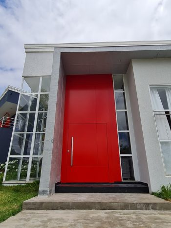 Entregamos a porta completa: porta, batente, guarnição, fechadura (a escolher), dobradiça pivotante, usinagens dos componentes e borracha de vedação.