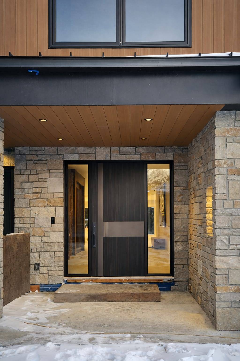 Porta em ACM bicolor (branco interno e madeirado externo), com puxador em ferro e design moderno, acompanhada de portal duplo lateral com vidro