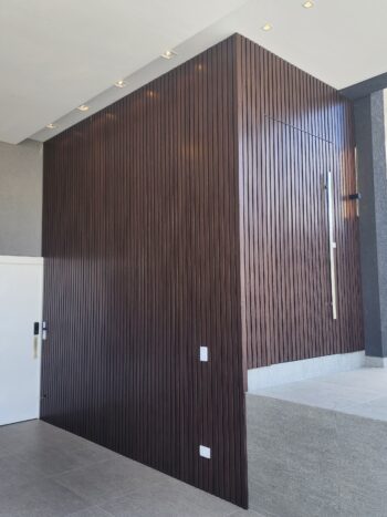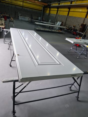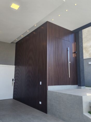 Porta com estrutura interna 100% em alumínio e revestida com chapa de ACM kynar 4 mm. Acompanha batente e vistas feito sob medida.