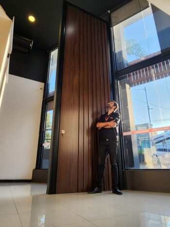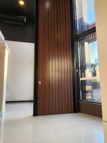 Porta com estrutura interna 100% em alumínio e revestida com chapa de ACM kynar 4 mm. Acompanha batente e vistas feito sob medida.