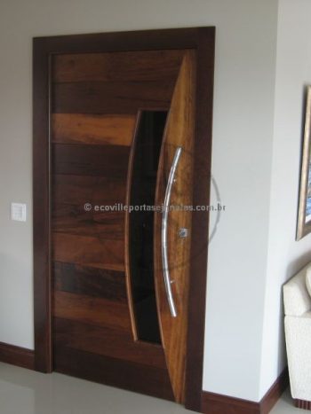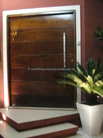 Entregamos a porta completa: porta, bandeira, batente, guarnição, fechadura, dobradiça pivotante, usinagens dos componentes, borracha de vedação, espuma, silicone, cola e parafusos.