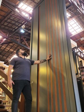 Porta com estrutura interna 100% em alumínio e revestida com chapa de ACM kynar 4 mm. Acompanha batente e vistas feito sob medida.