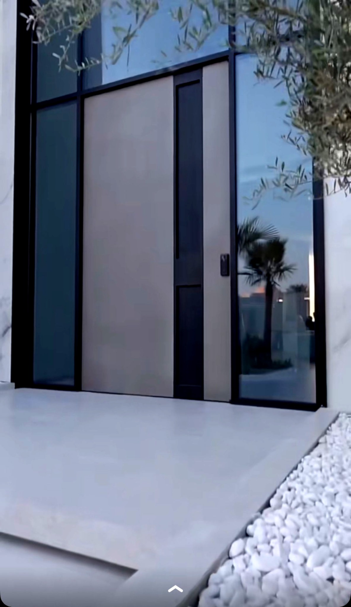 Porta pivotante em ACM com puxador especial, acompanhada de portal e bandeira com vidro panorâmico