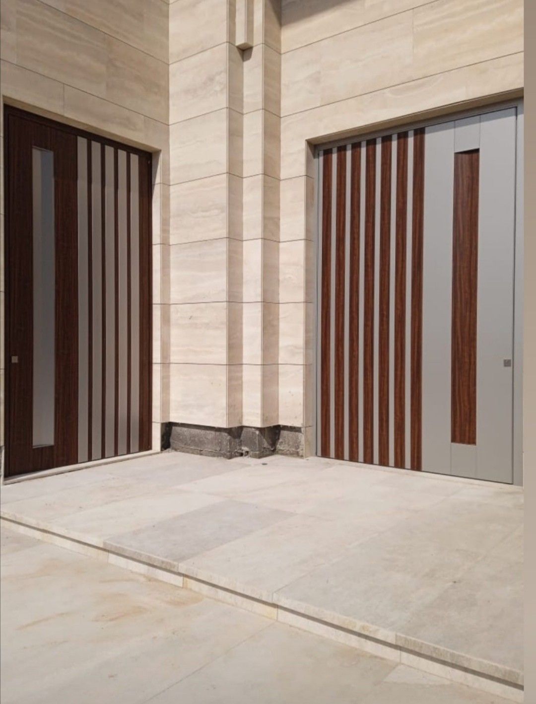 Porta com estrutura interna 100% em alumínio e revestida com chapa de ACM kynar 4 mm. Acompanha batente e vistas feito sob medida.