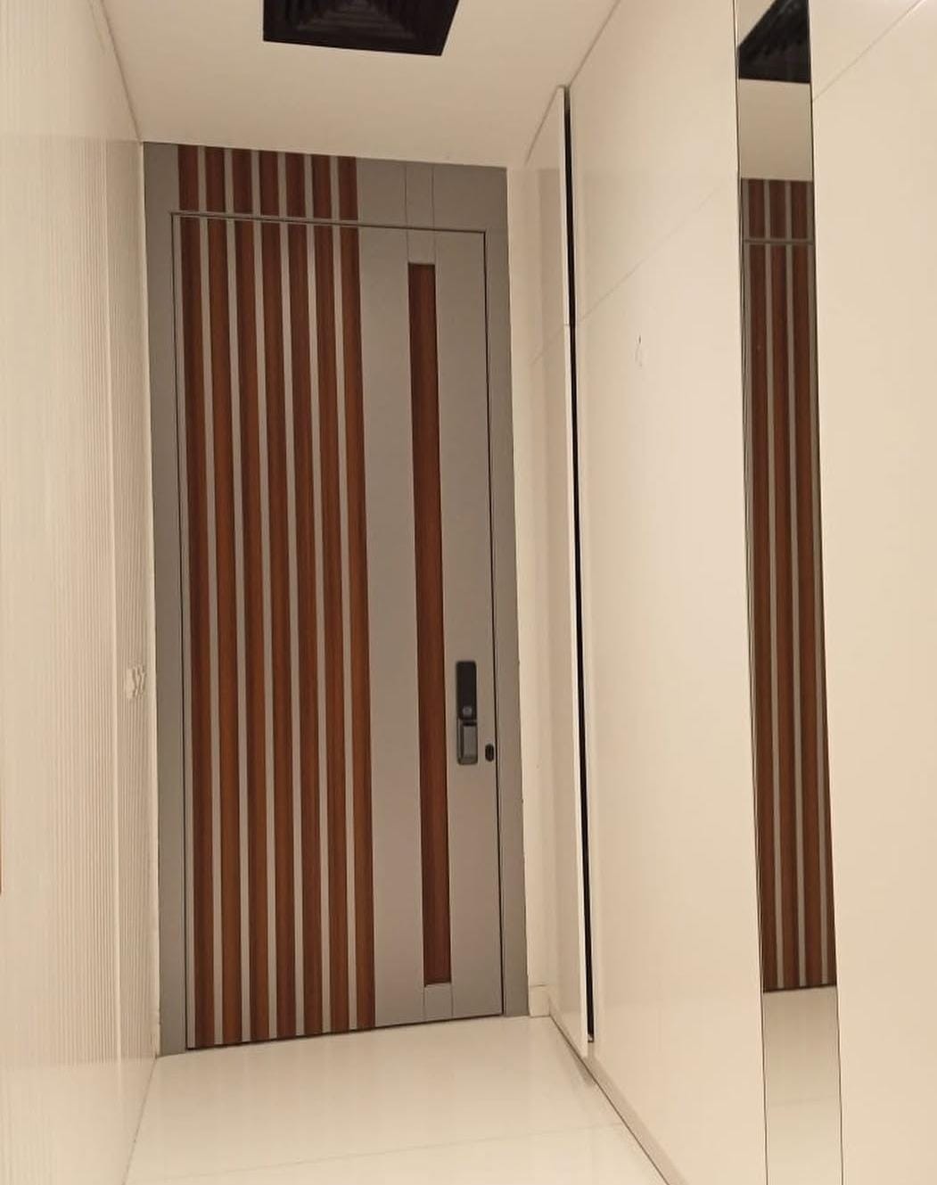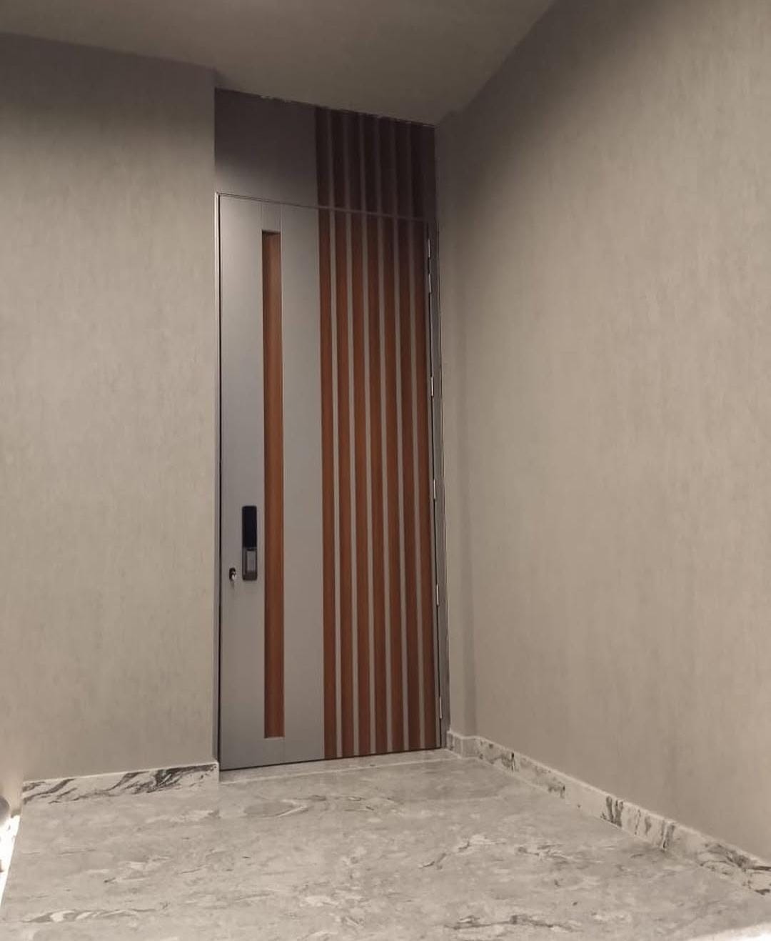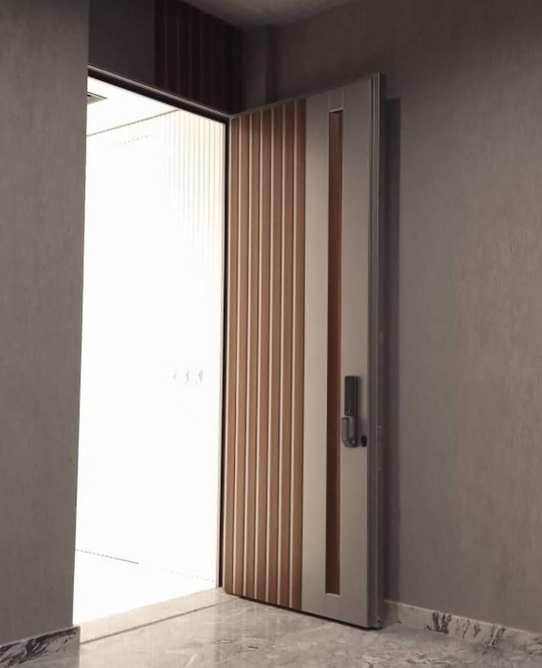 Porta em ACM com puxador cava especial detalhes ripado vertical