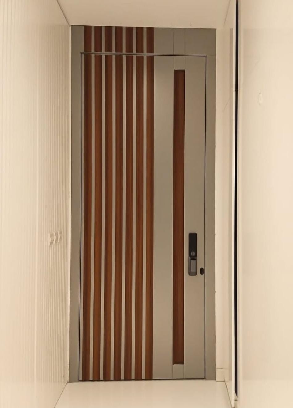 Porta com estrutura interna 100% em alumínio e revestida com chapa de ACM kynar 4 mm. Acompanha batente e vistas feito sob medida.