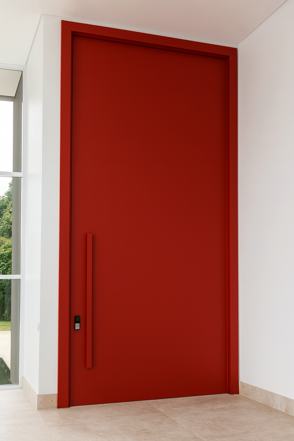 Porta pivotante em ACM lisa com puxador vermelho