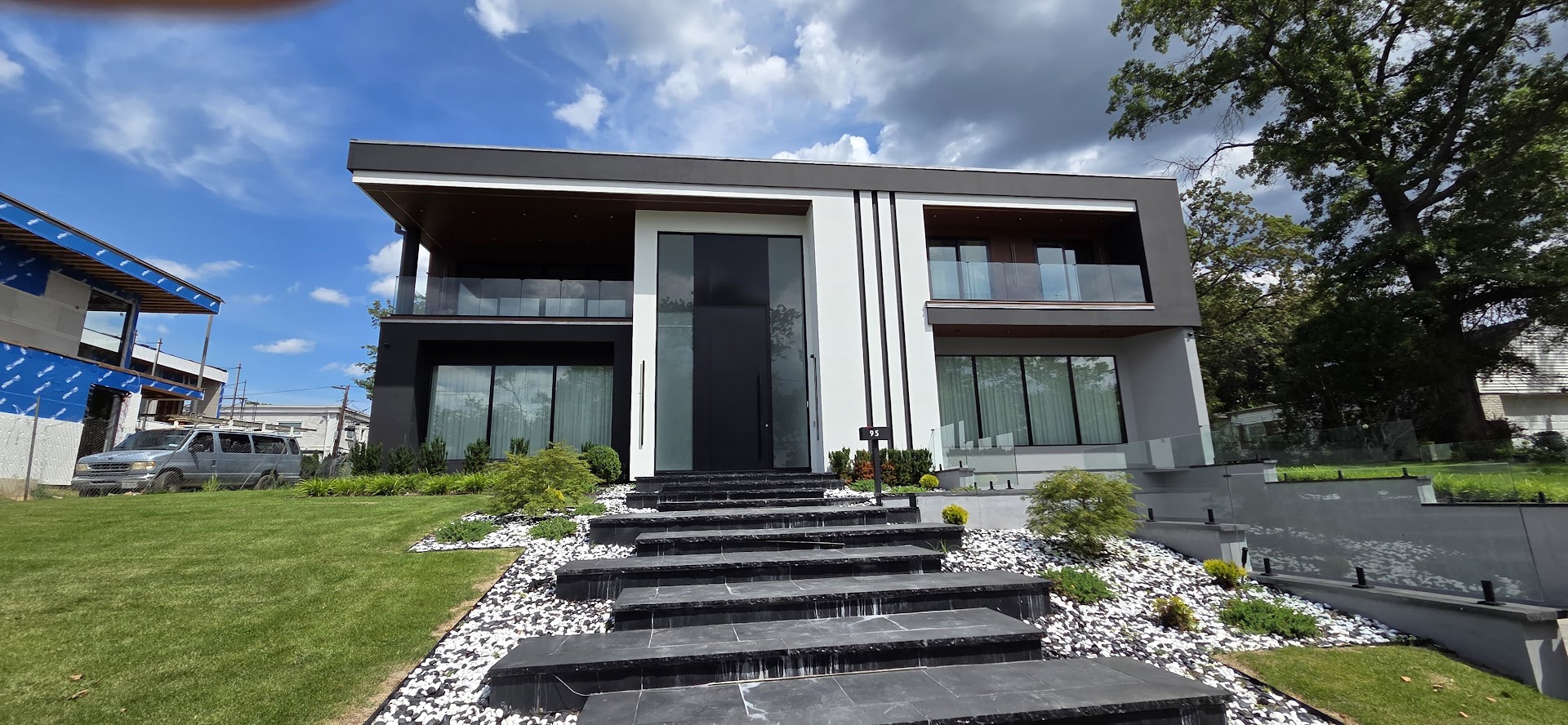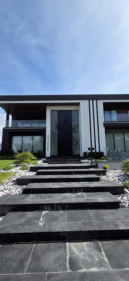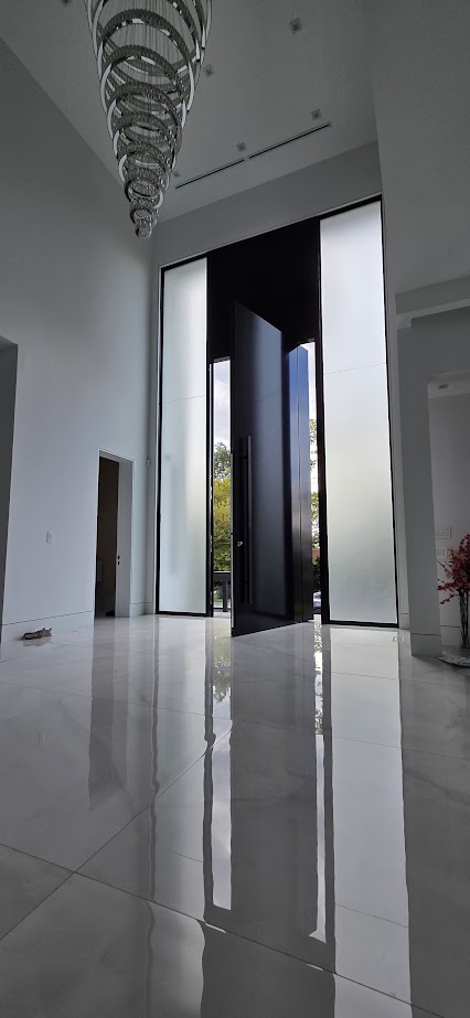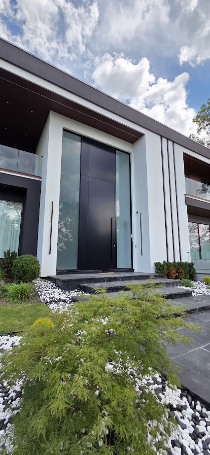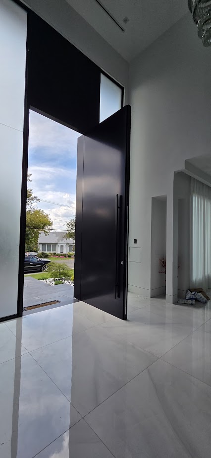 Porta pivotante em ACM preto fosco com portais duplos laterais em vidro.