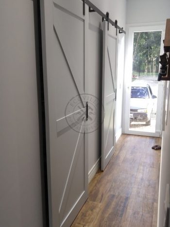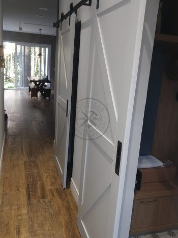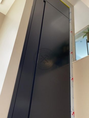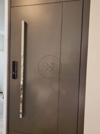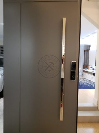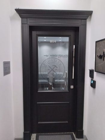 Porta pivotante em ACM amadeirado com bandeira superior...