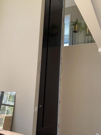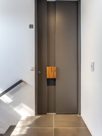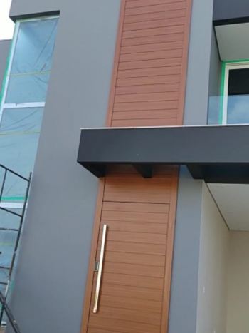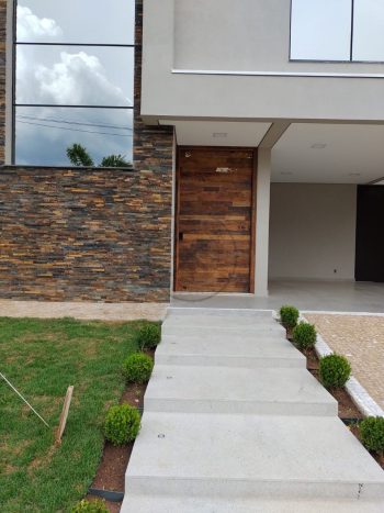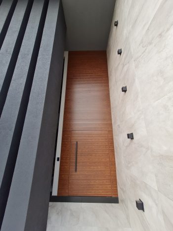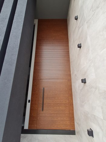 Porta pivotante em ACM amadeirado ripado na horizontal...